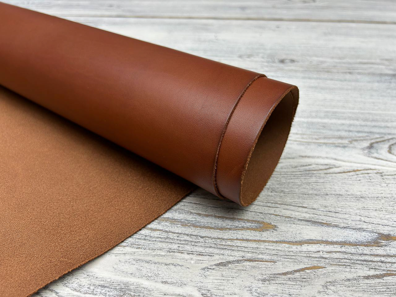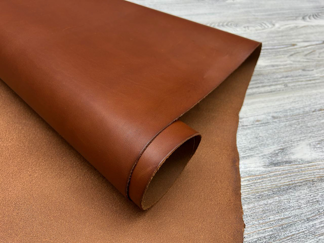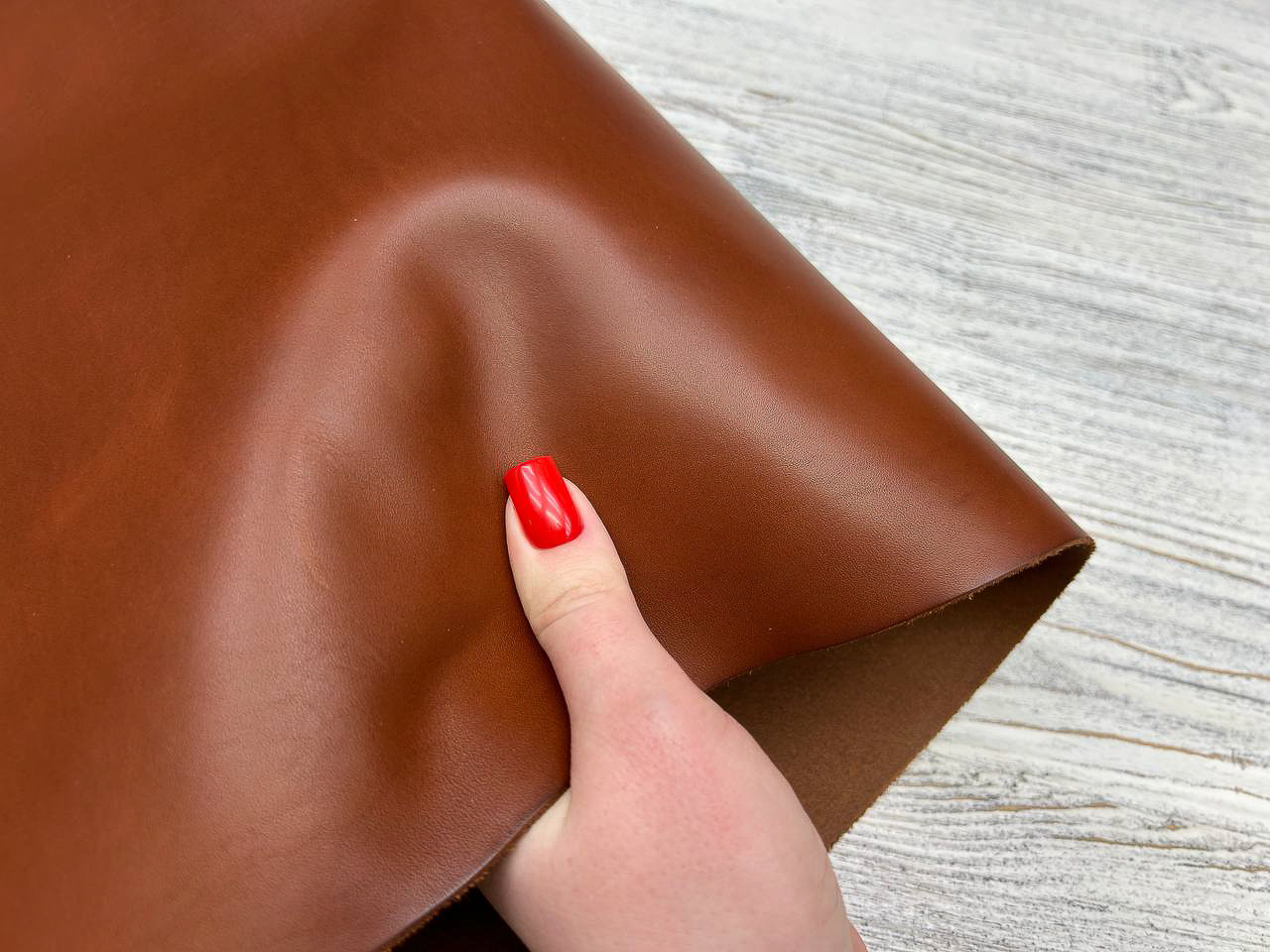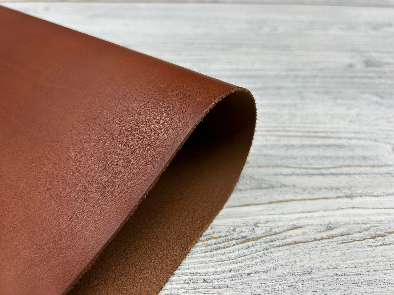 Лицевая поверхность: Гладкая, наполненная, насыщенного коньячного цвета. Плотная, но при этом пластичная, хорошо ложится в изделия, которые должны держать форму.