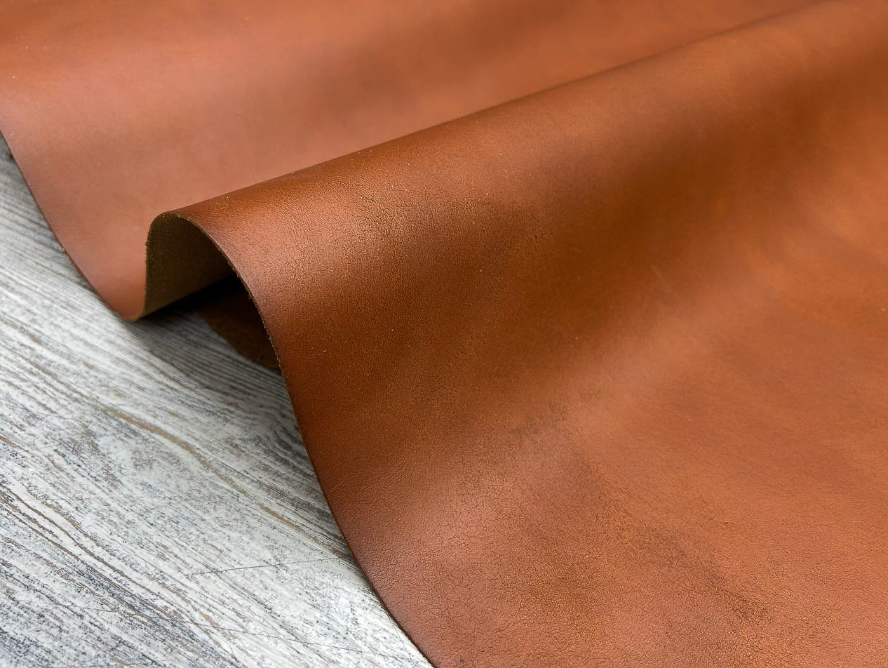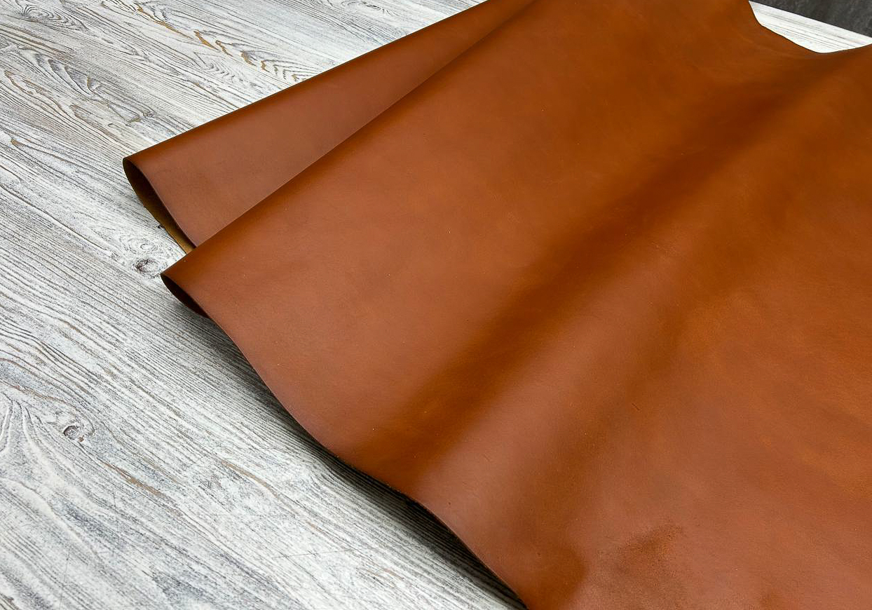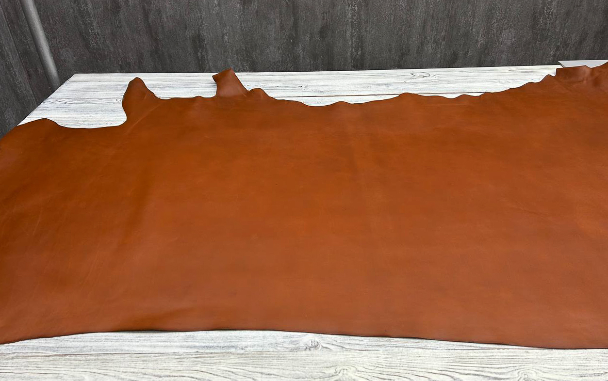 Лицевая поверхность: Гладкая кожа насыщенного коньячного цвета. Плотная, но при этом пластичная, хорошо ложится в изделия, которые должны держать форму.