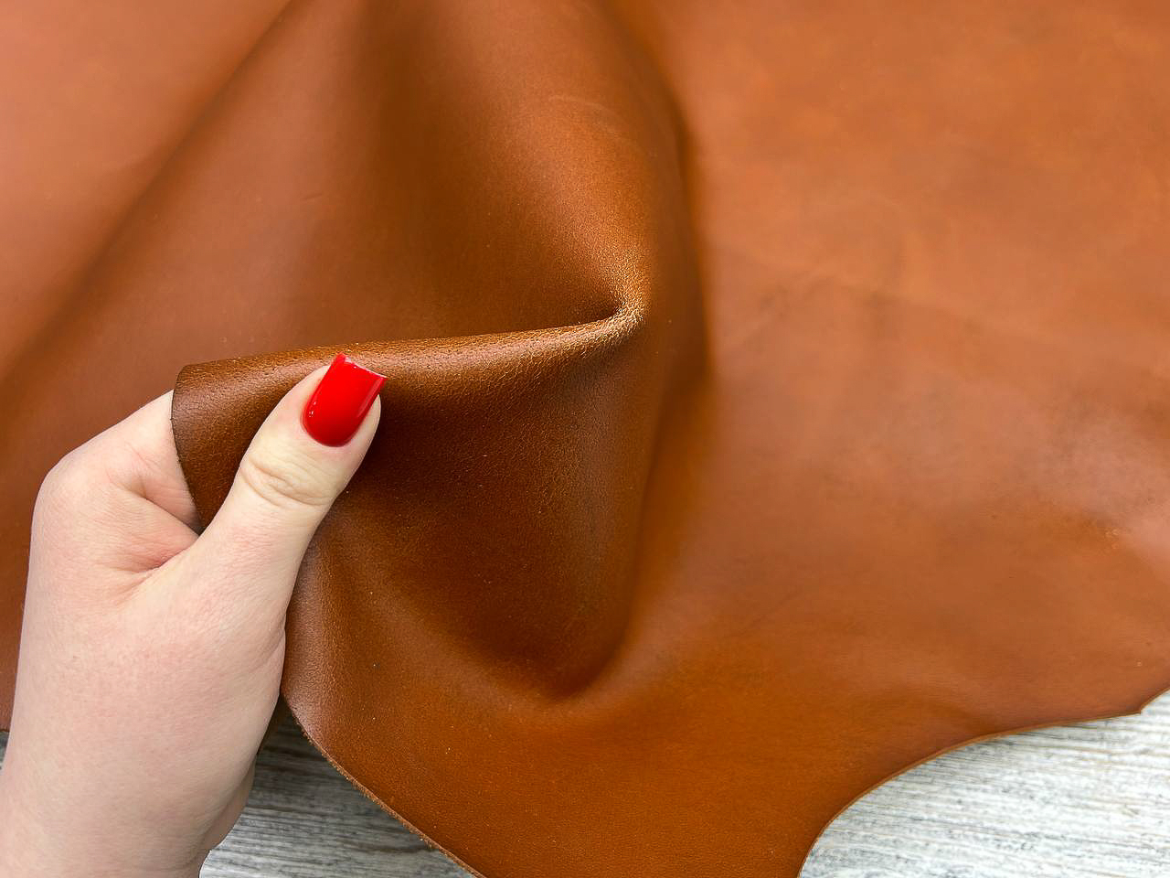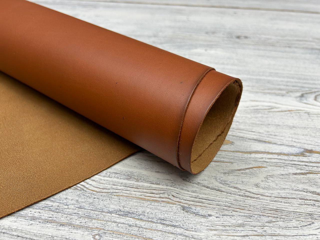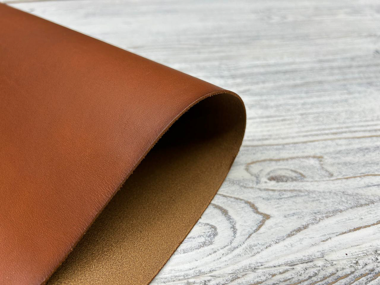 Лицевая поверхность: Гладкая кожа насыщенного коньячного цвета. Плотная, но при этом пластичная, хорошо ложится в изделия, которые должны держать форму.