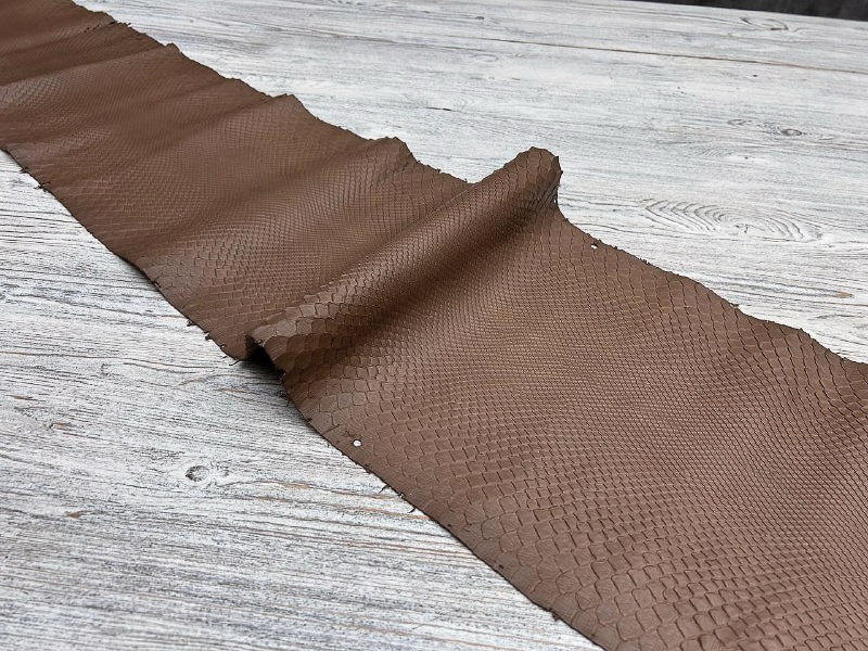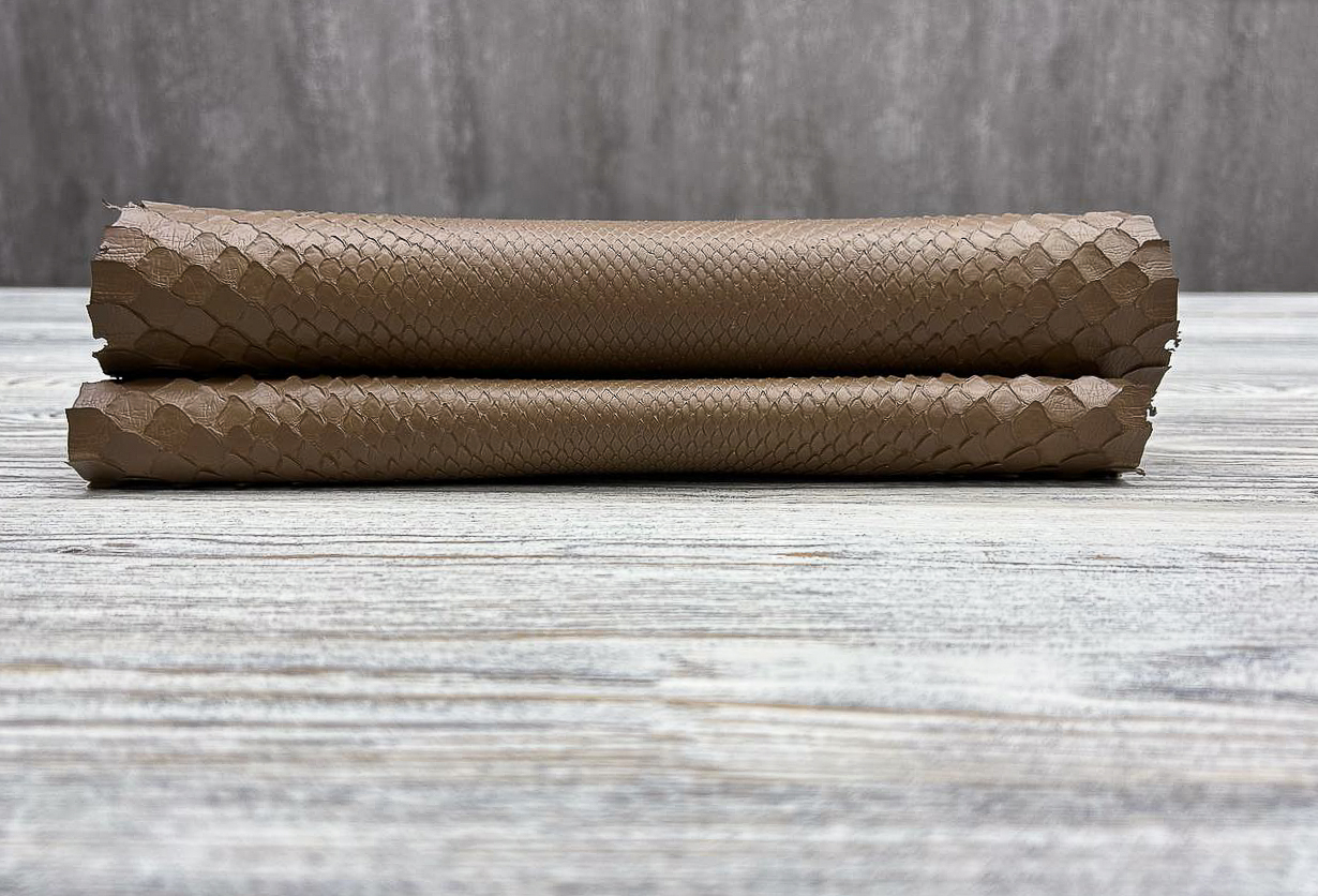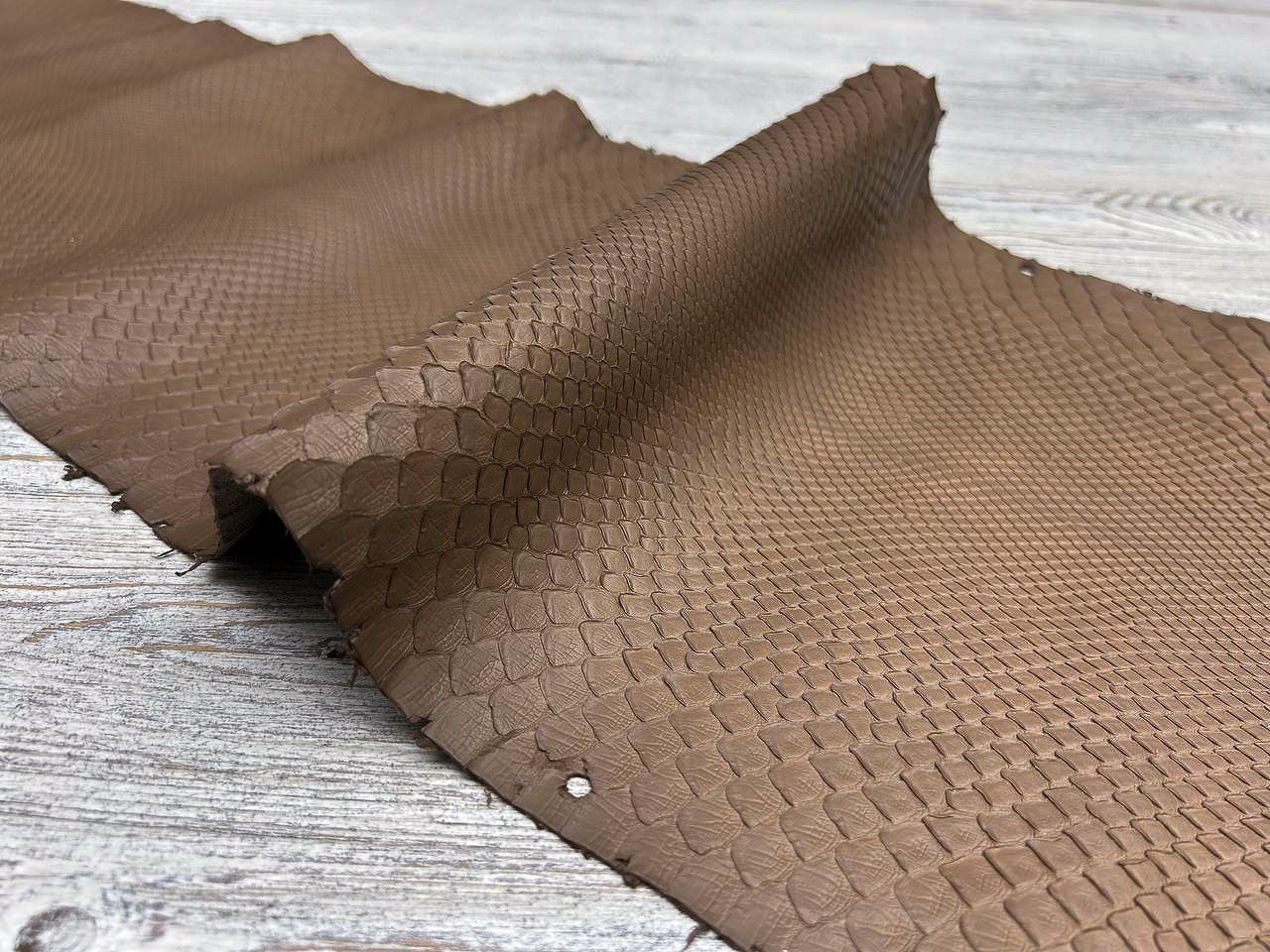 Эта кожа — ответ на вопрос о том, как создать изделие, которое цепляет взгляды. Приглушенный светло-коричневый цвет, подчеркивающий каждую чешуйку натурального узора, и матовое лицо создают эффект роскоши и строгости одновременно. Тактильная поверхность и способность в меру держать форму делают ее превосходным выбором для конструктивных изделий.