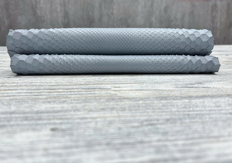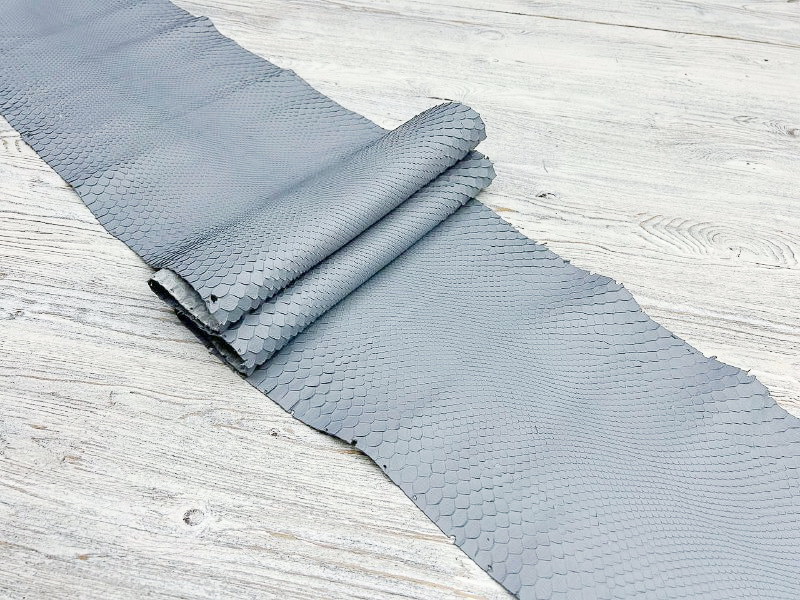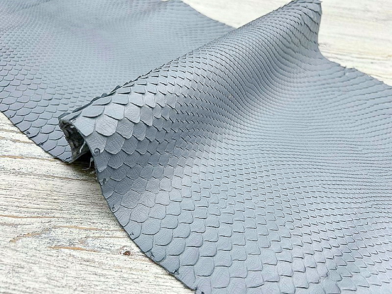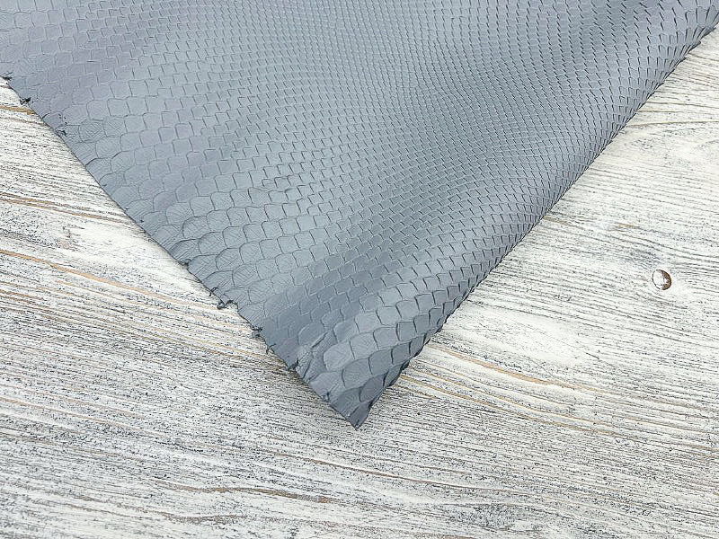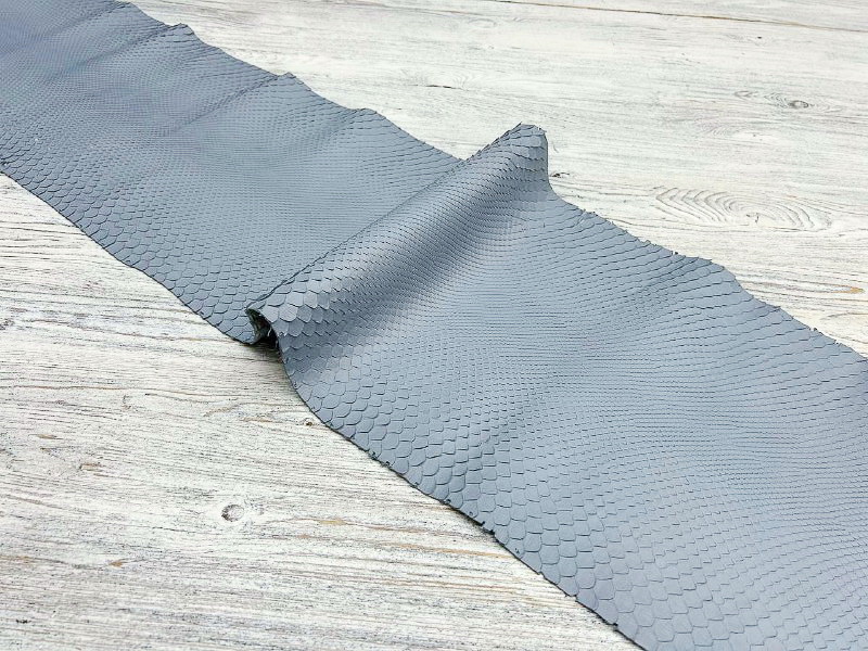 Эта кожа — ответ на вопрос о том, как создать изделие, которое цепляет взгляды. Приглушенный серо-голубой оттенок, подчеркивающий каждую чешуйку натурального узора, и матовое лицо создают эффект роскоши и строгости одновременно. Тактильная поверхность и способность в меру держать форму делают ее превосходным выбором для конструктивных изделий.