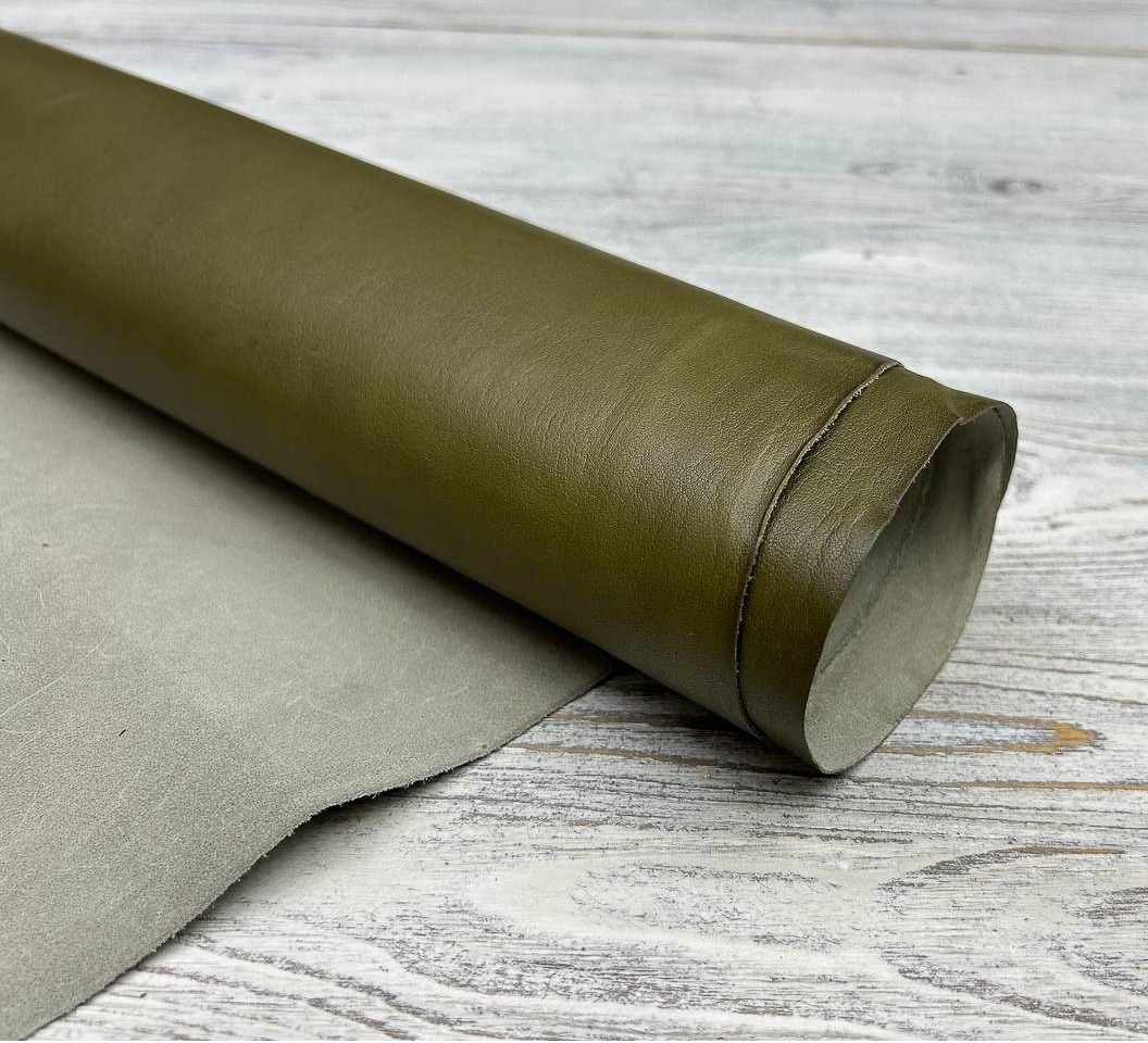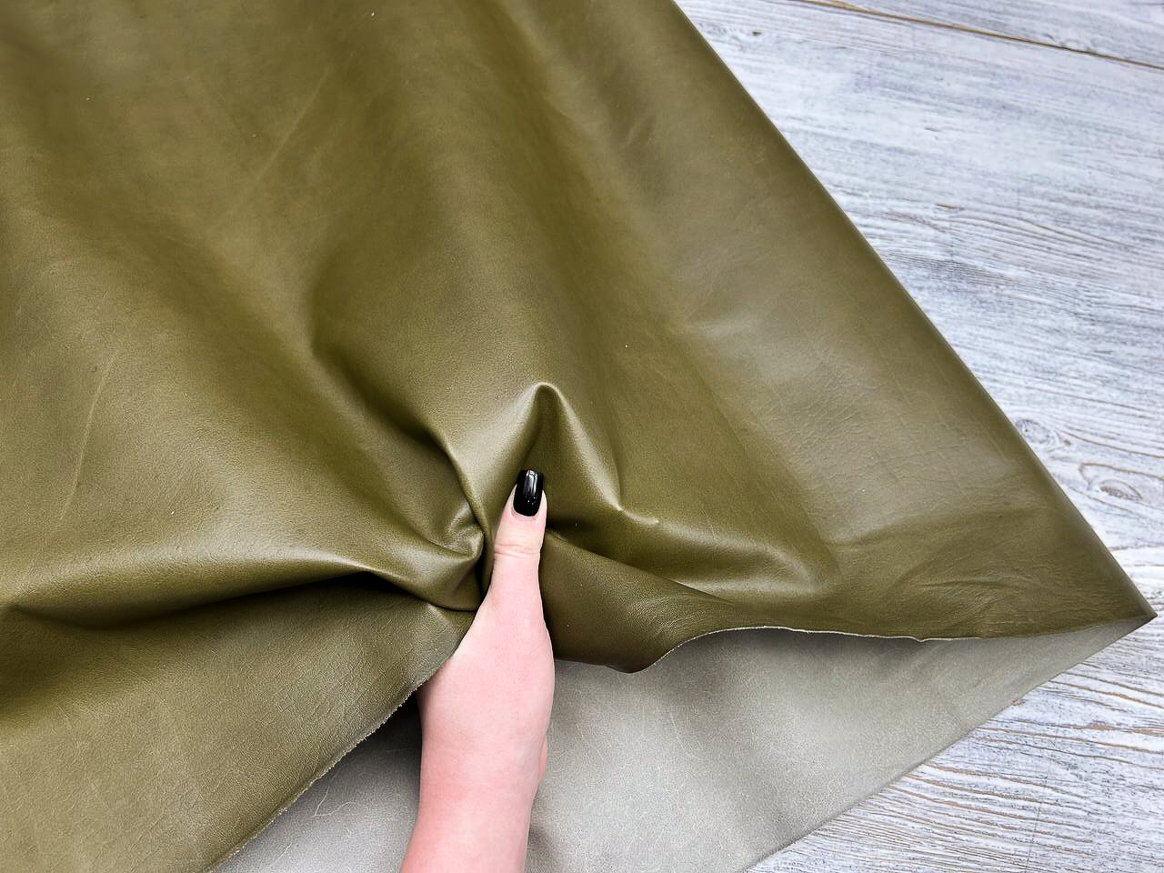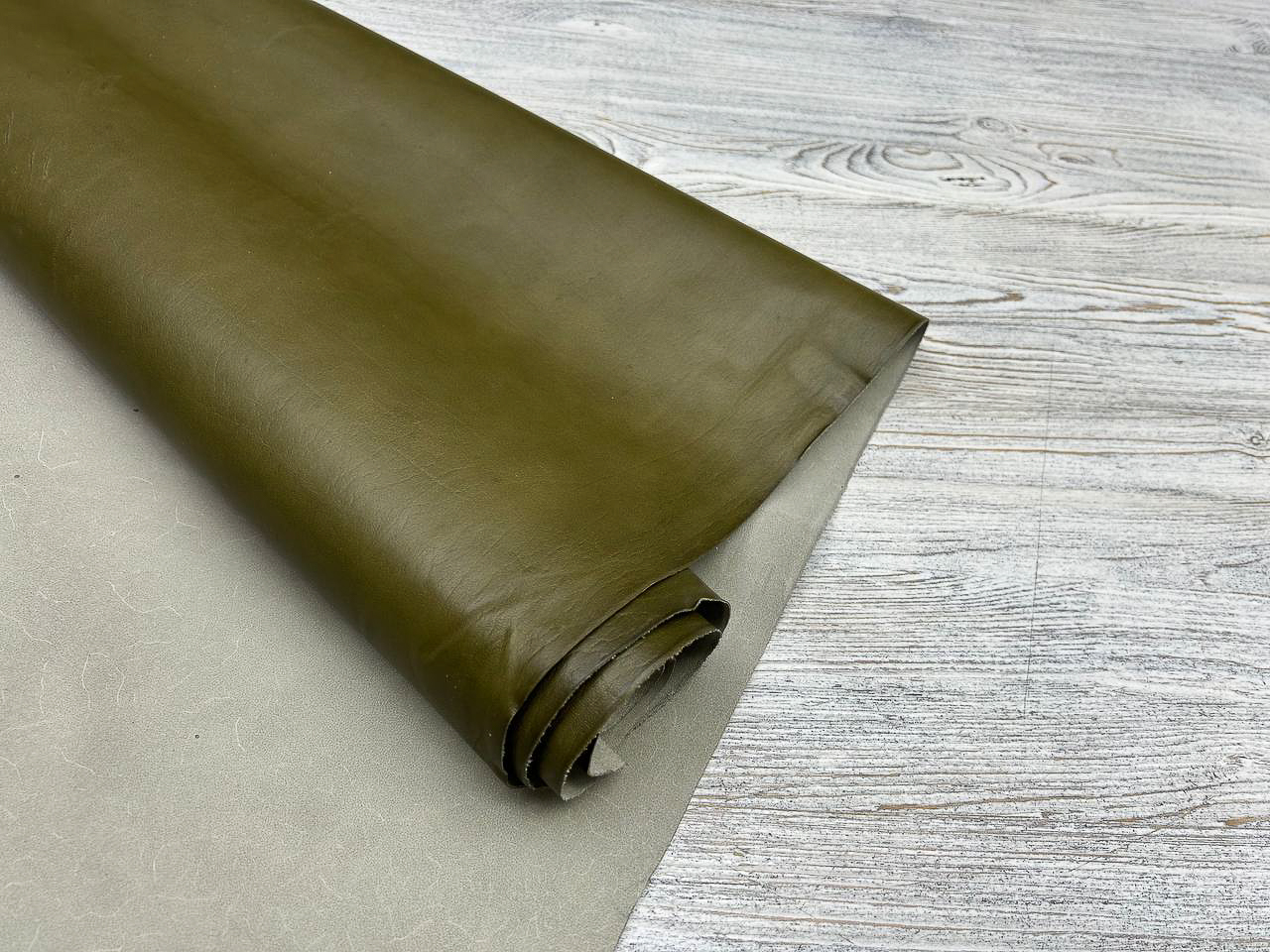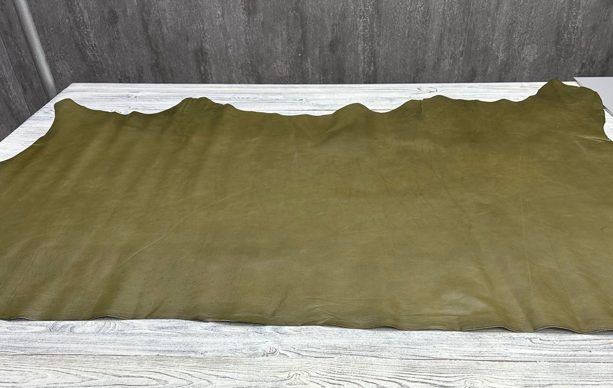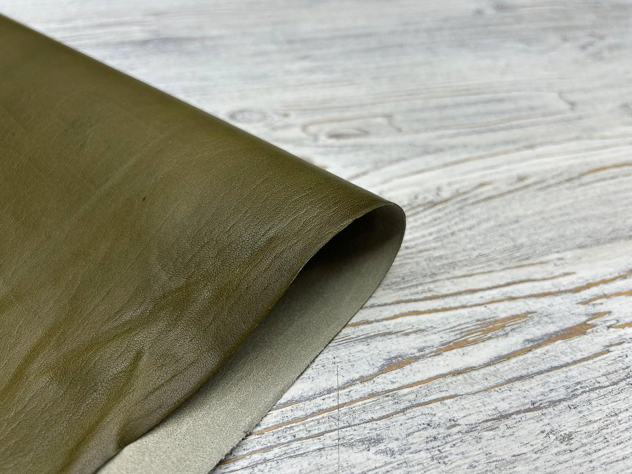 Лицевая поверхность: Гладкая, максимально наполненная, насыщенного зеленовато-оливкового цвета. Достаточно плотная, но при этом пластичная, хорошо ложится в изделия, а также способна в меру держать форму.