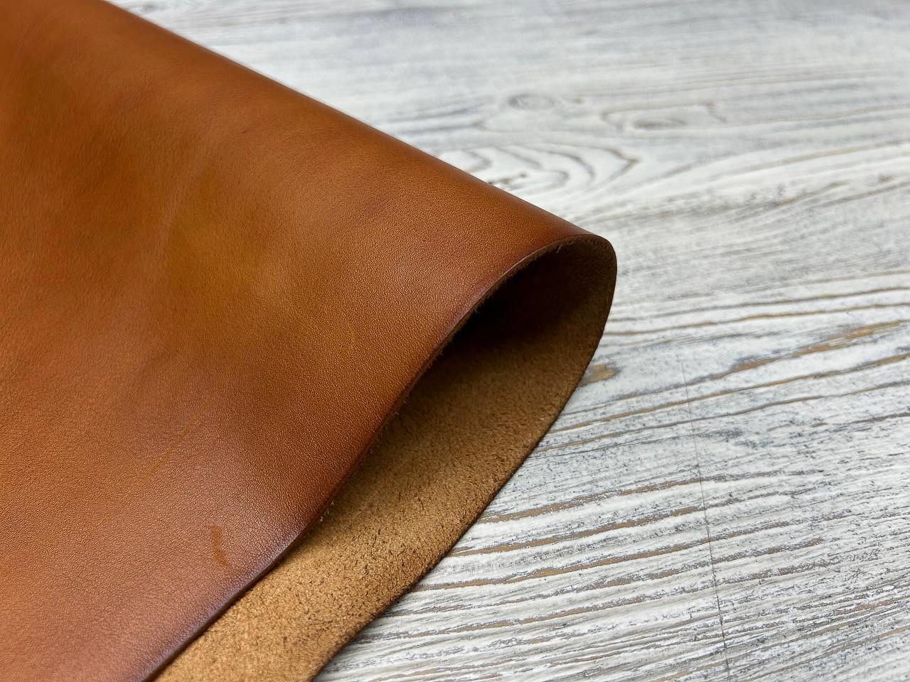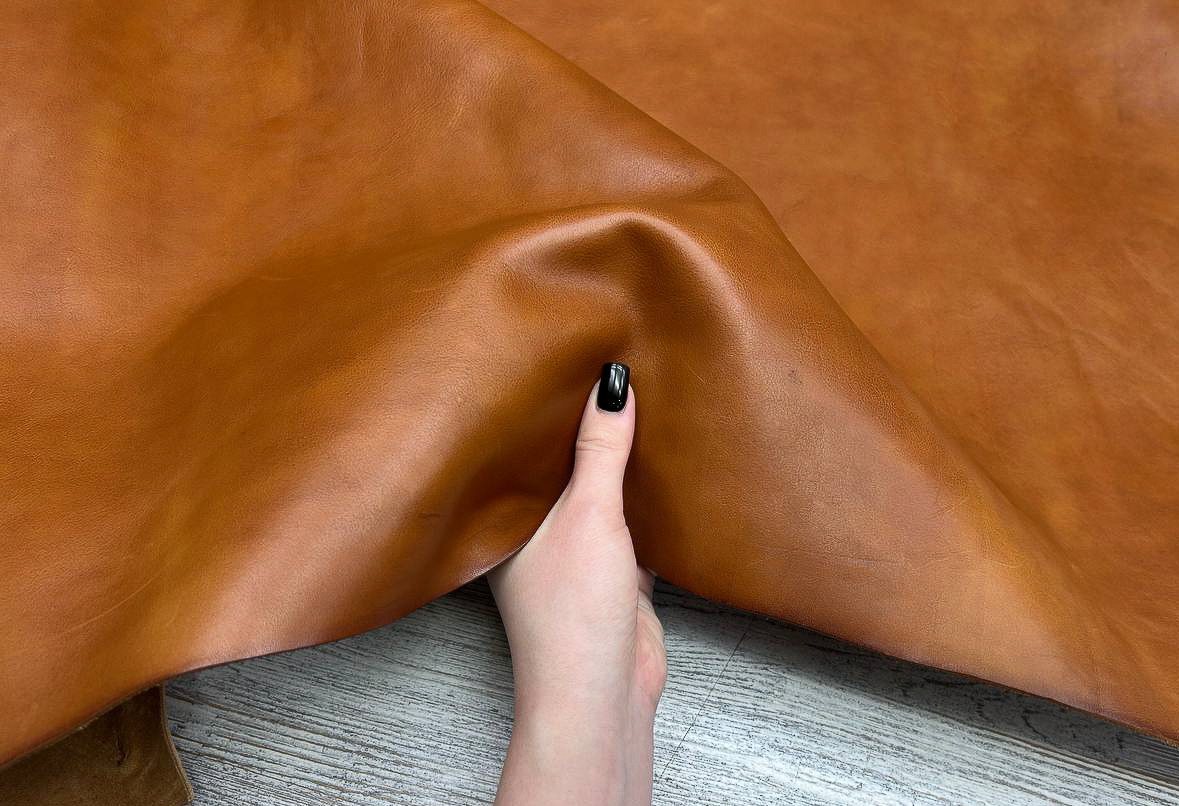 Лицевая поверхность: С легким неравномерным натуральным зерном и красивым слегка облачным окрасом, кожа достаточно наполненная, красивого коньячного цвета. Плотная, но при этом пластичная, хорошо ложится в изделия различной формы.