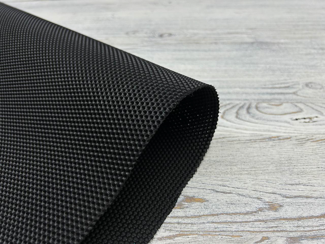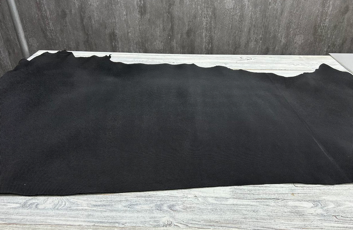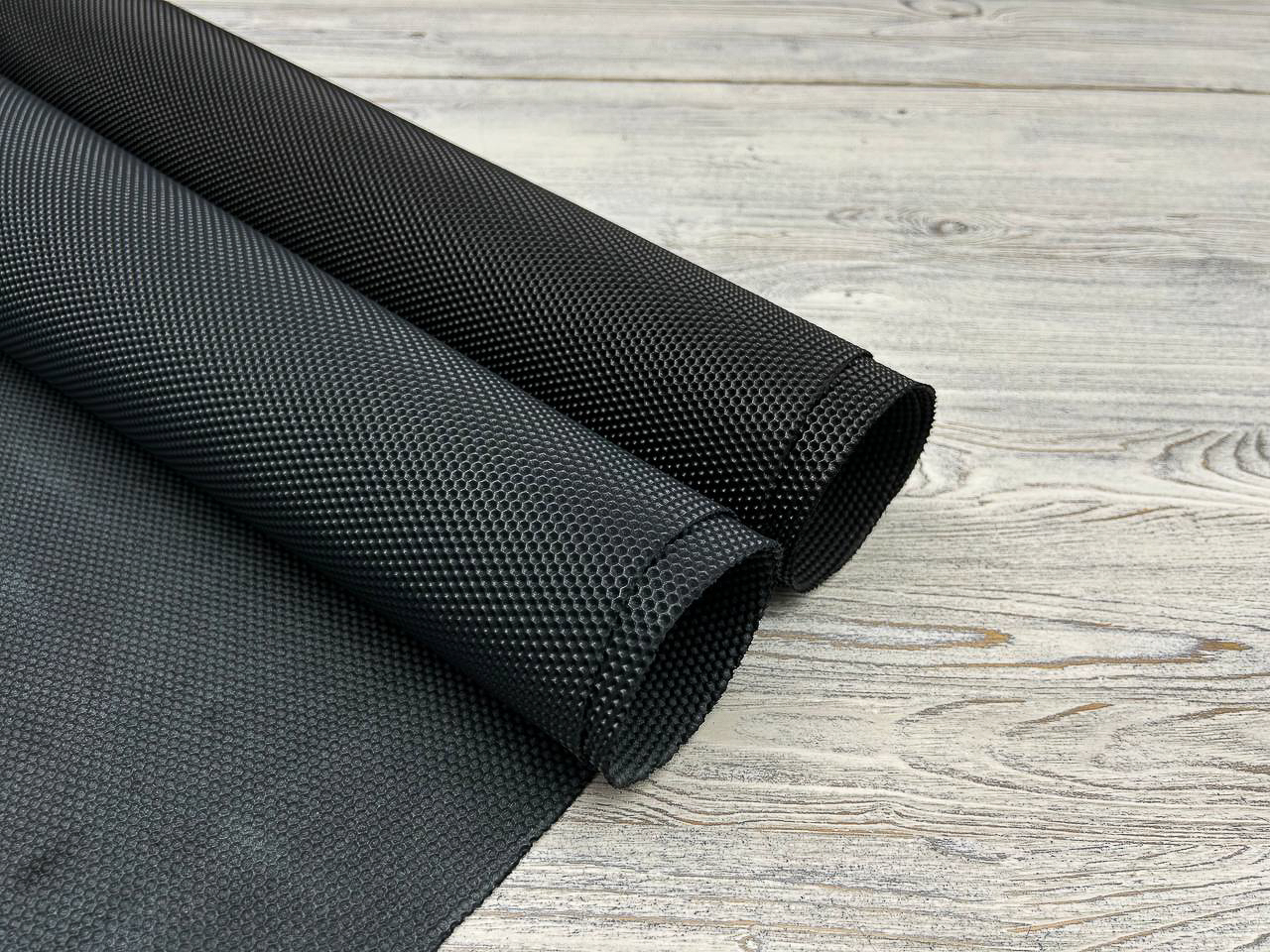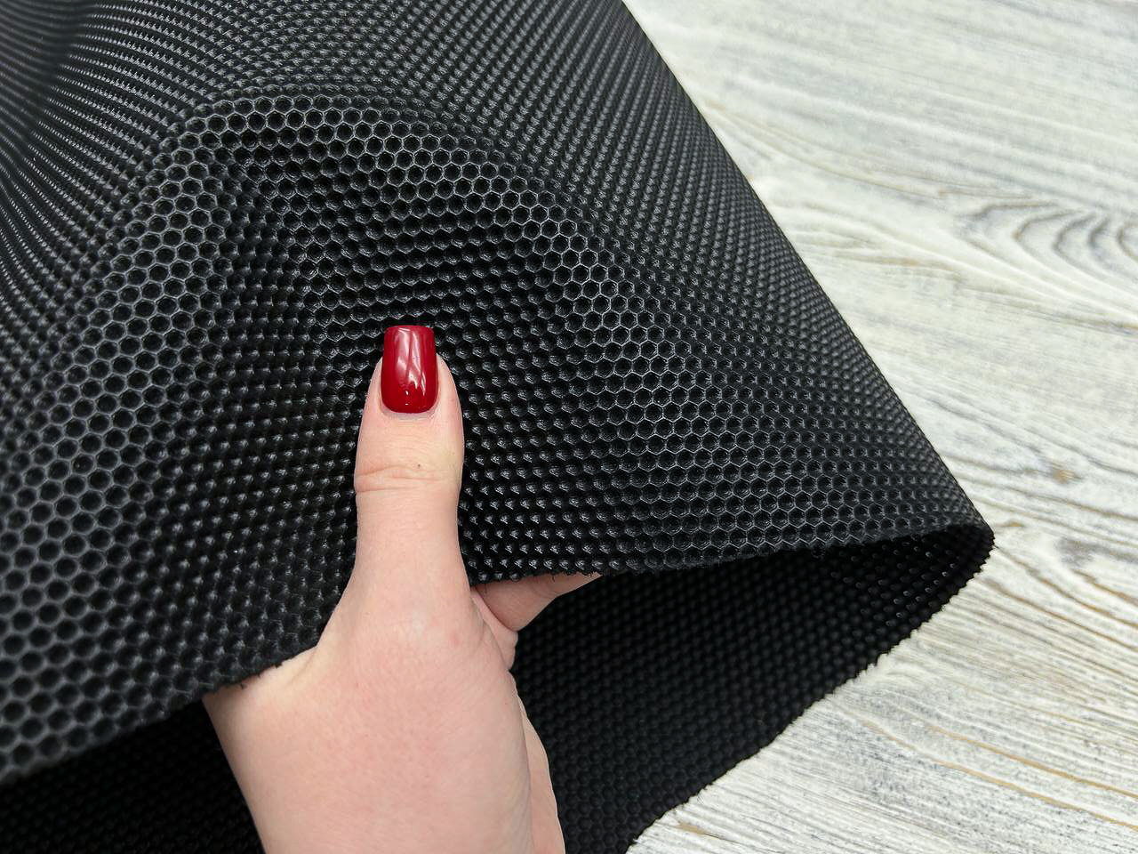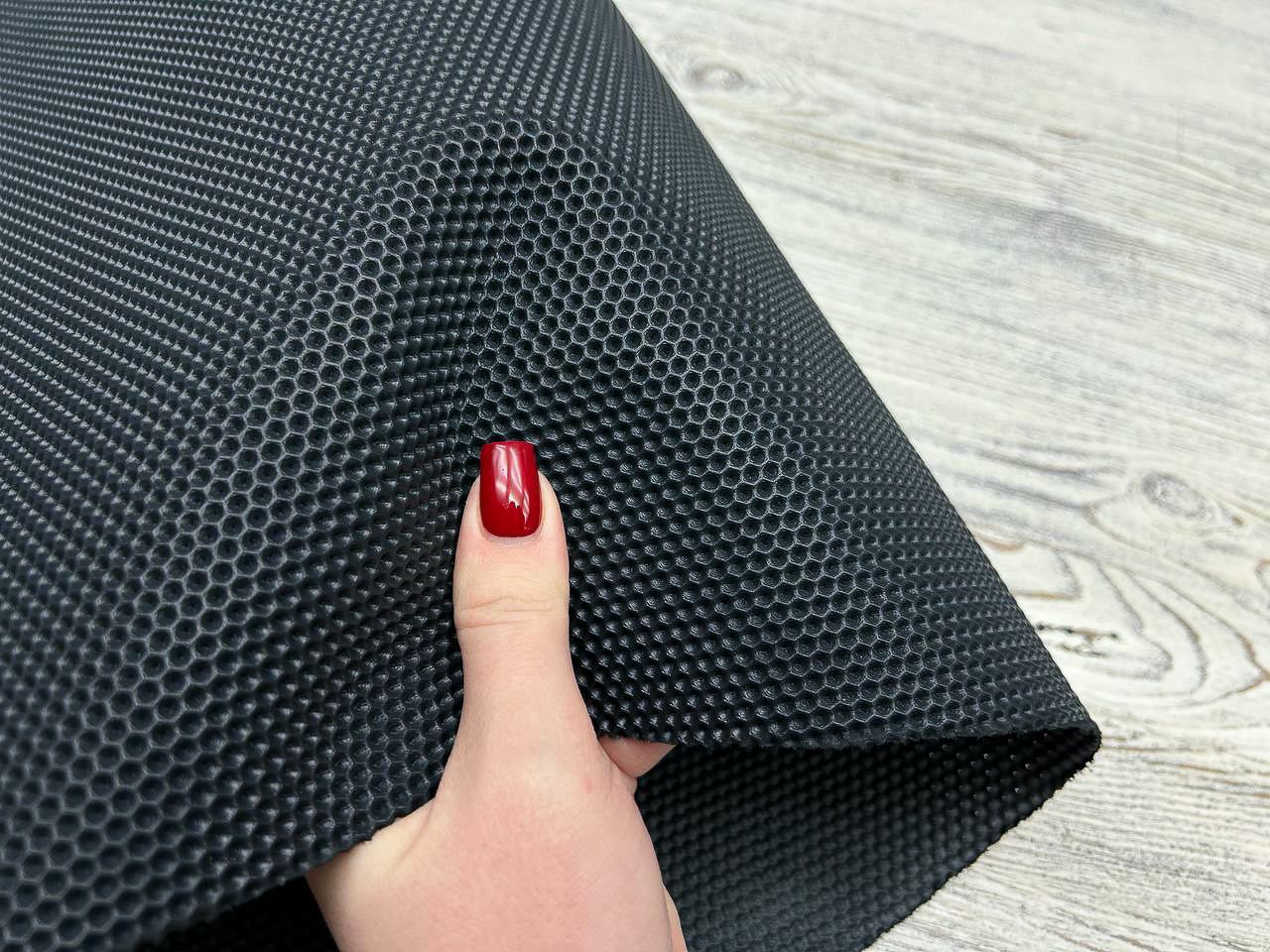 Артикул с глубоким объёмным тиснением в виде симметричных пчелиных сот, сквозного окраса в двух оттенках темно-серая и черная. Кожа достаточно хорошо держит форму.
